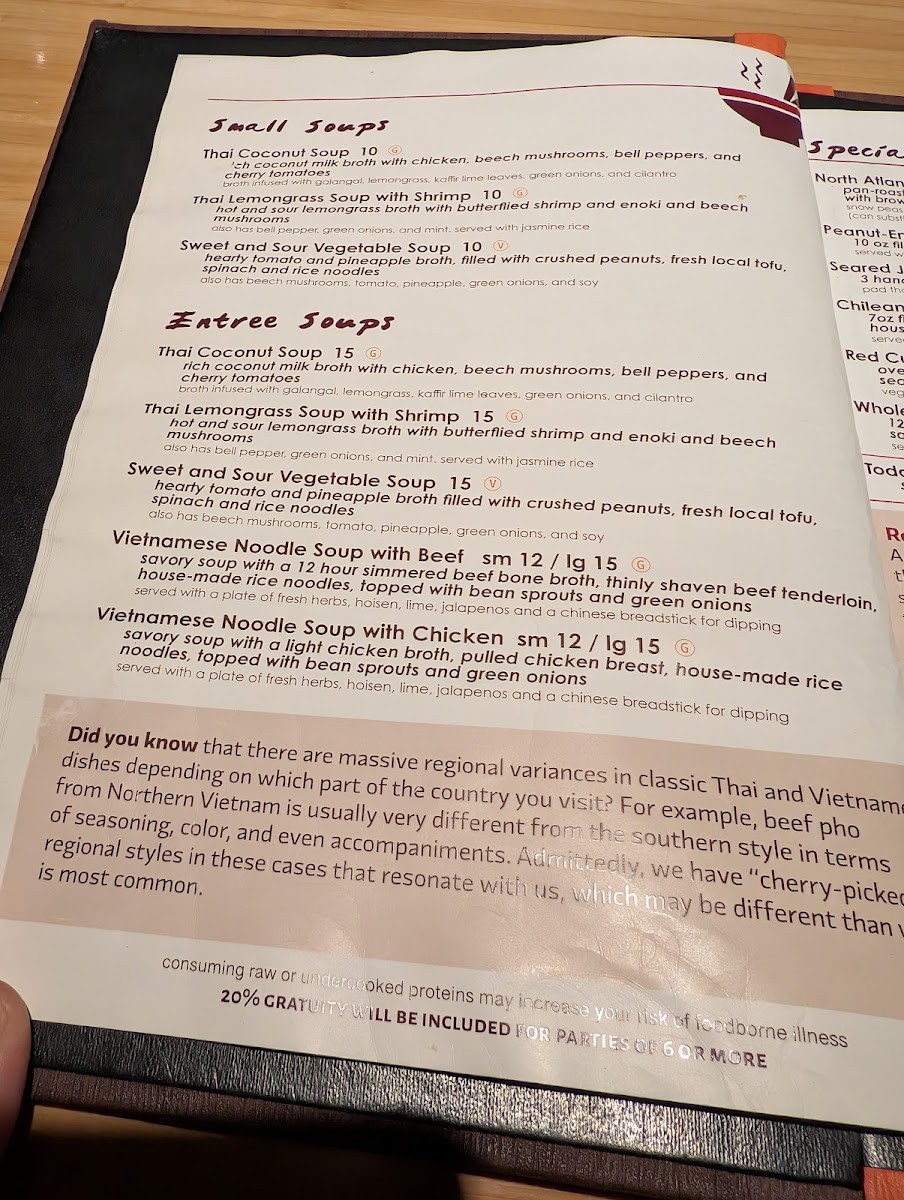 Hearty tomato and pineapple broth filled with crushed peanuts, fresh local tofu, spinach, and rice noodles also have beech mushrooms, tomato, pineapple, green onions, and soy.