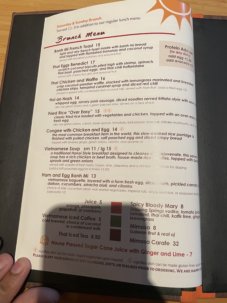 Seasoned minced pork with Thai basil, served on a bed of seasoned jasmine rice and topped with a farm-fresh over-easy egg cooked with carrots, tomatoes, onion, cilantro, and Thai chilies.